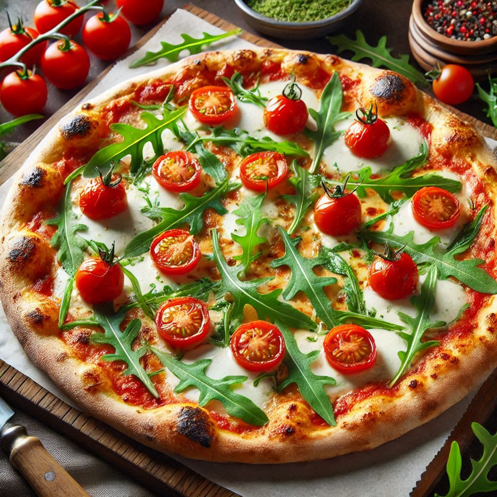 - 구운 피자 위에 신선한 루꼴라를 올리고 올리브 오일을 뿌려 완성합니다.