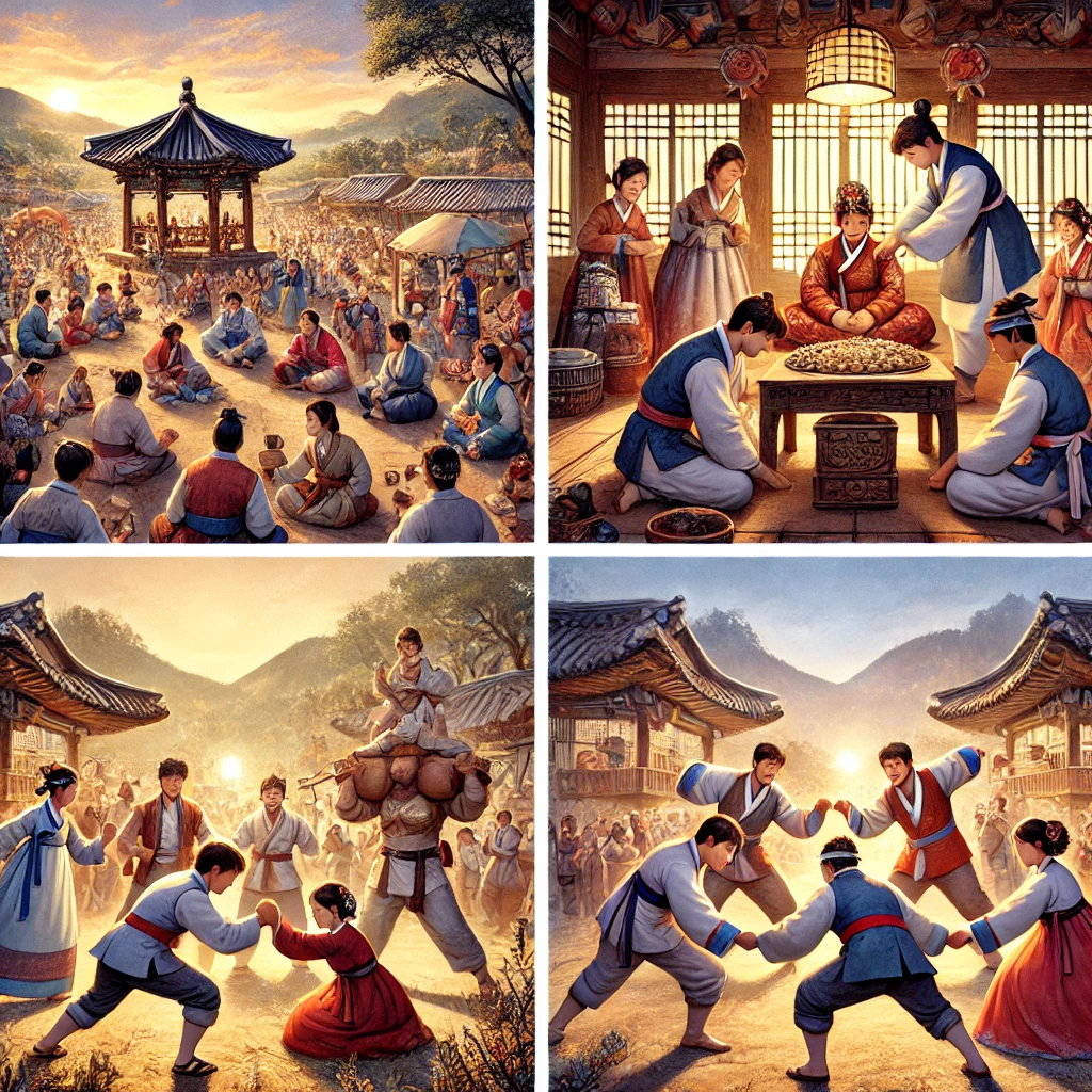 • 백중놀이: 백중제에서는 다양한 전통 놀이가 행해졌습니다. 대표적인 놀이로는 씨름, 줄다리기, 소싸움 등이 있으며, 이 놀이들은 마을 사람들이 힘을 겨루고, 서로의 결속을 다지는 중요한 시간이었습니다. 특히, 씨름은 백중제의 대표적인 놀이로, 마을 최고의 장사를 가리는 중요한 행사였습니다.