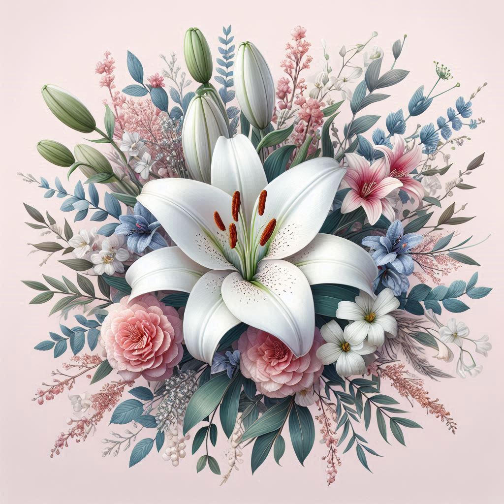 흰색 백합은 가장 대표적인 백합으로, "순결", "고귀함", "신성함"을 의미합니다. 결혼식에서 신부 부케로 많이 사용되며, 성스러운 분위기를 연출하는 데 적합합니다. 또한, 장례식에서도 자주 사용되는데, 이는 망자의 영혼이 깨끗하게 천국으로 가길 바라는 의미를 담고 있습니다.