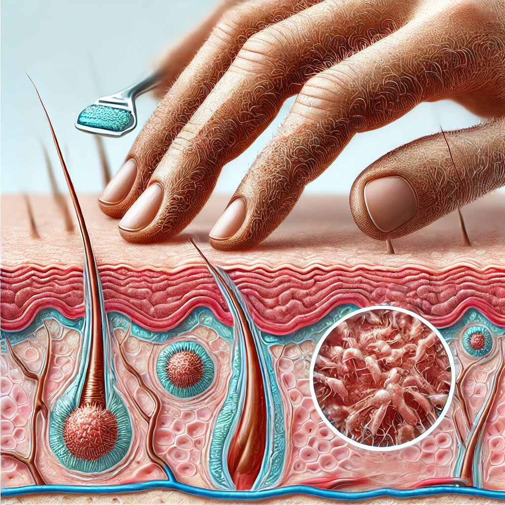 - 각질 축적: 각질이 정상적으로 탈락되지 않고 피부 표면에 쌓이면 모공이 막히게 됩니다. 이로 인해 털이 피부 밖으로 나오지 못하고, 피부 안쪽에 갇히는 결과를 초래합니다.