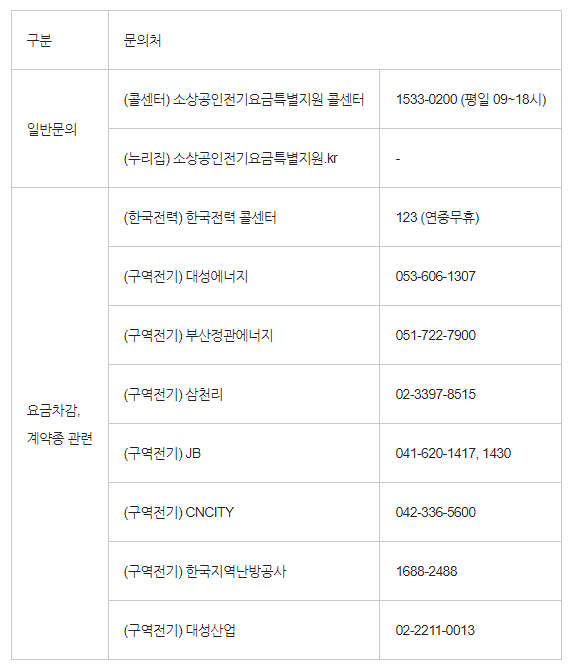 • 소상공인 전기요금 특별지원 콜센터: 1533 - 0200