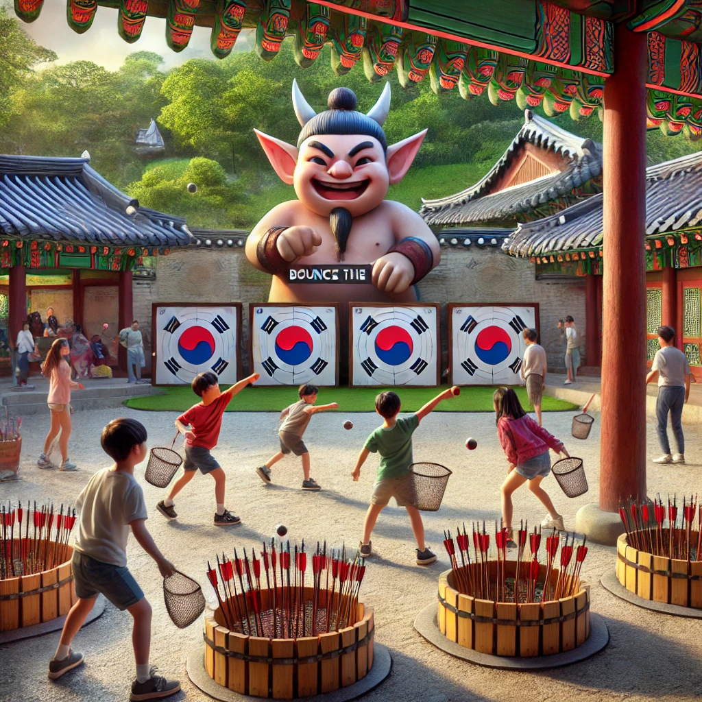 튕겨투호는 공을 투호 구멍에 던져 넣는 놀이로, 도깨비 '모리'와 함께 정확성과 집중력을 겨뤄보는 콘텐츠입니다. 투호 게임을 통해 어린이들은 전통 놀이의 재미를 느끼며, 손 눈 협응력을 기를 수 있습니다.