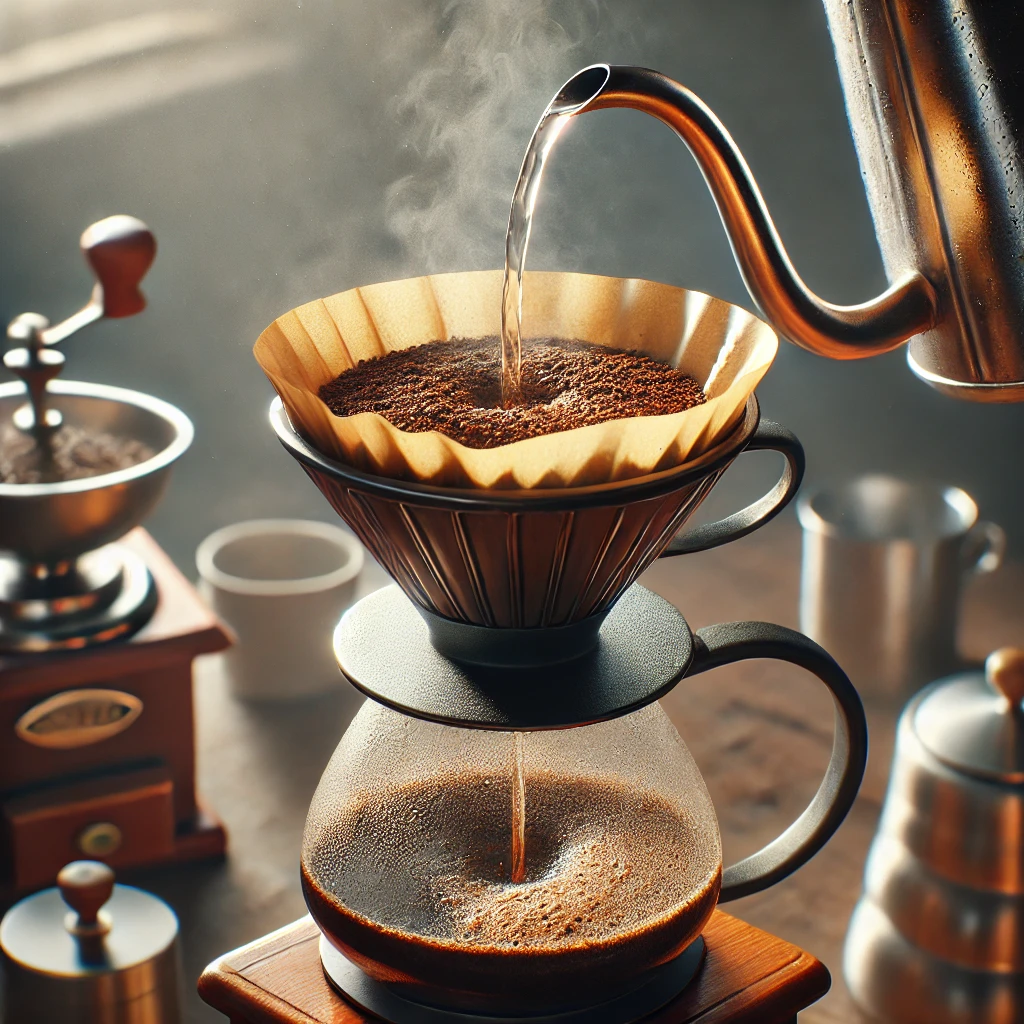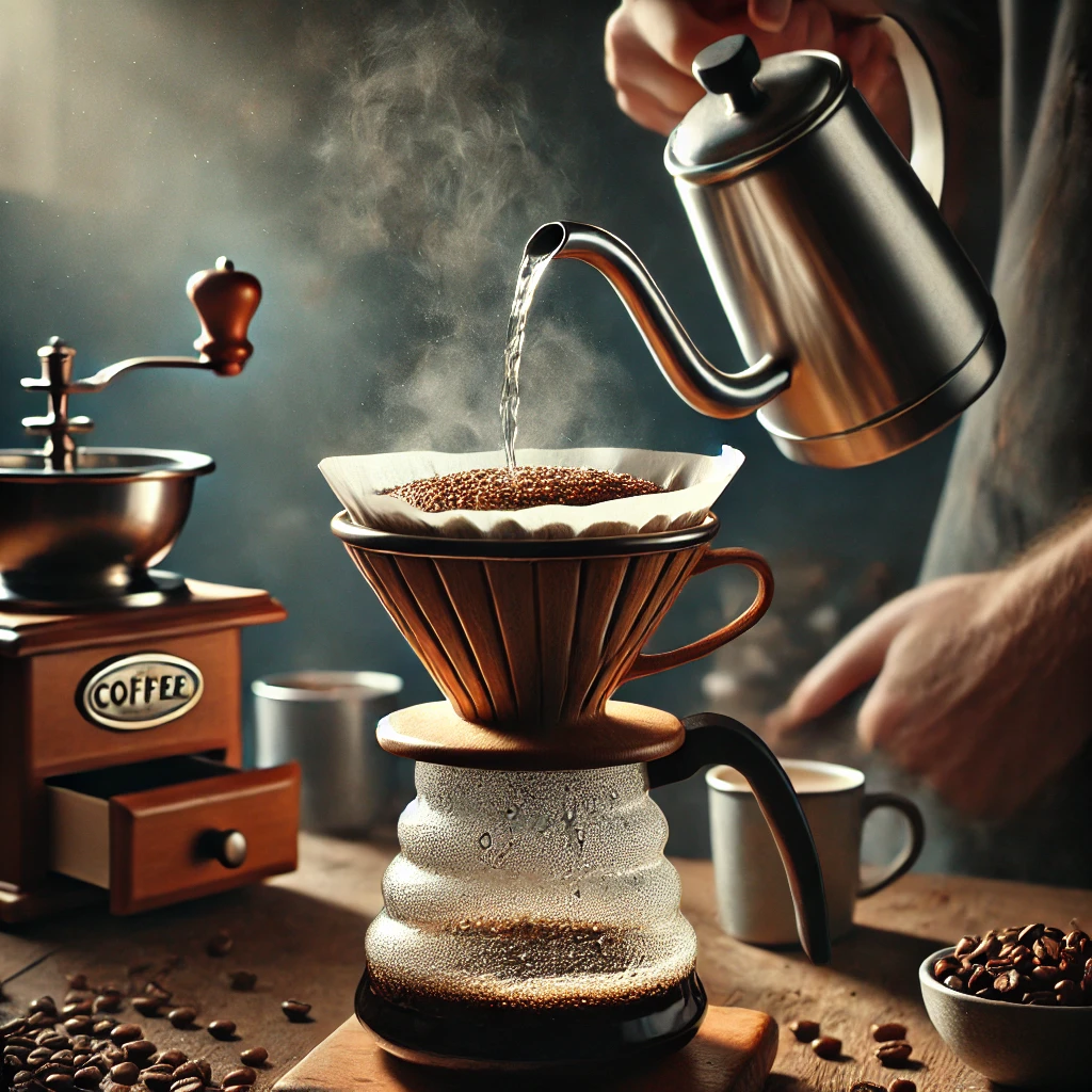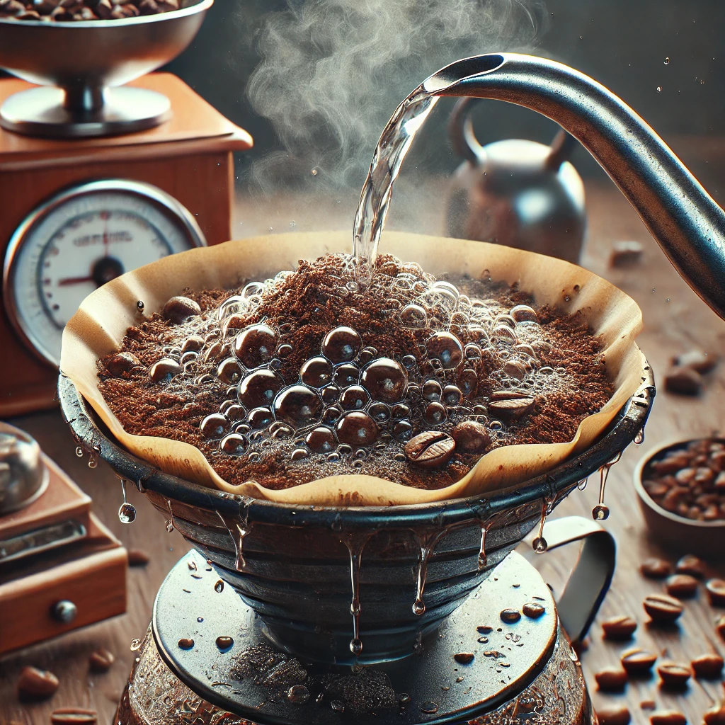 두 번째 단계는 커피 원두를 드리퍼에 올려놓고 뜨거운 물로 살짝 적셔주는 '블루밍' 과정입니다. 이 과정은 커피가 물과 처음 만났을 때 이산화탄소를 배출하면서 물이 원두 전체에 고르게 스며들 수 있도록 도와줍니다. 블루밍은 보통 약 30초 정도 진행되며, 이 과정을 통해 커피의 본격적인 추출을 준비합니다.