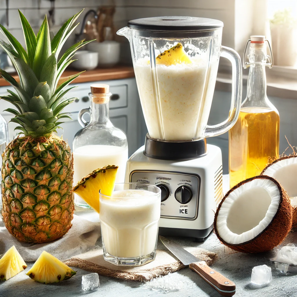 - 믹서기에 화이트 럼, 파인애플 주스, 코코넛 크림, 얼음을 넣고 갈아준다.