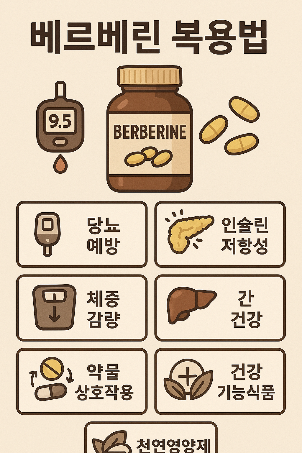 베르베린 복용법의 기본 이해베르베린은 전통 의학에서 수천 년간 사용되어 온 천연 성분으로, 현대 의학에서도 그 효능이 과학적으로 입증되고 있습니다. 다양한 약용 식물에서 추출되는 알칼로이드 계열 화합물로, 특히 황련, 오레곤 그레이프, 코파티스 등에서 얻어지며, 동양의 한방에서는 소화기 질환이나 감염 치료에 사용되어 왔습니다. 최근에는 이 성분이 가진 혈당 조절 능력과 항염, 항균 작용으로 인해 건강보조제로 각광받고 있습니다. 일반적으로 베르베린은 캡슐 또는 정제 형태로 섭취하며, 하루 권장량은 900~1500mg 정도입니다. 이 용량은 **한 번에 다 복용하기보다는 300~500mg씩 하루 3번 나눠 섭취**하는 것이 효과적입니다. 이는 베르베린이 체내에서 빠르게 대사되고 배출되는 특성이 있기 때문에,..